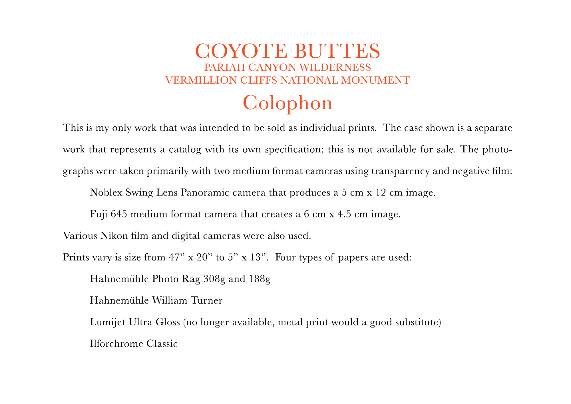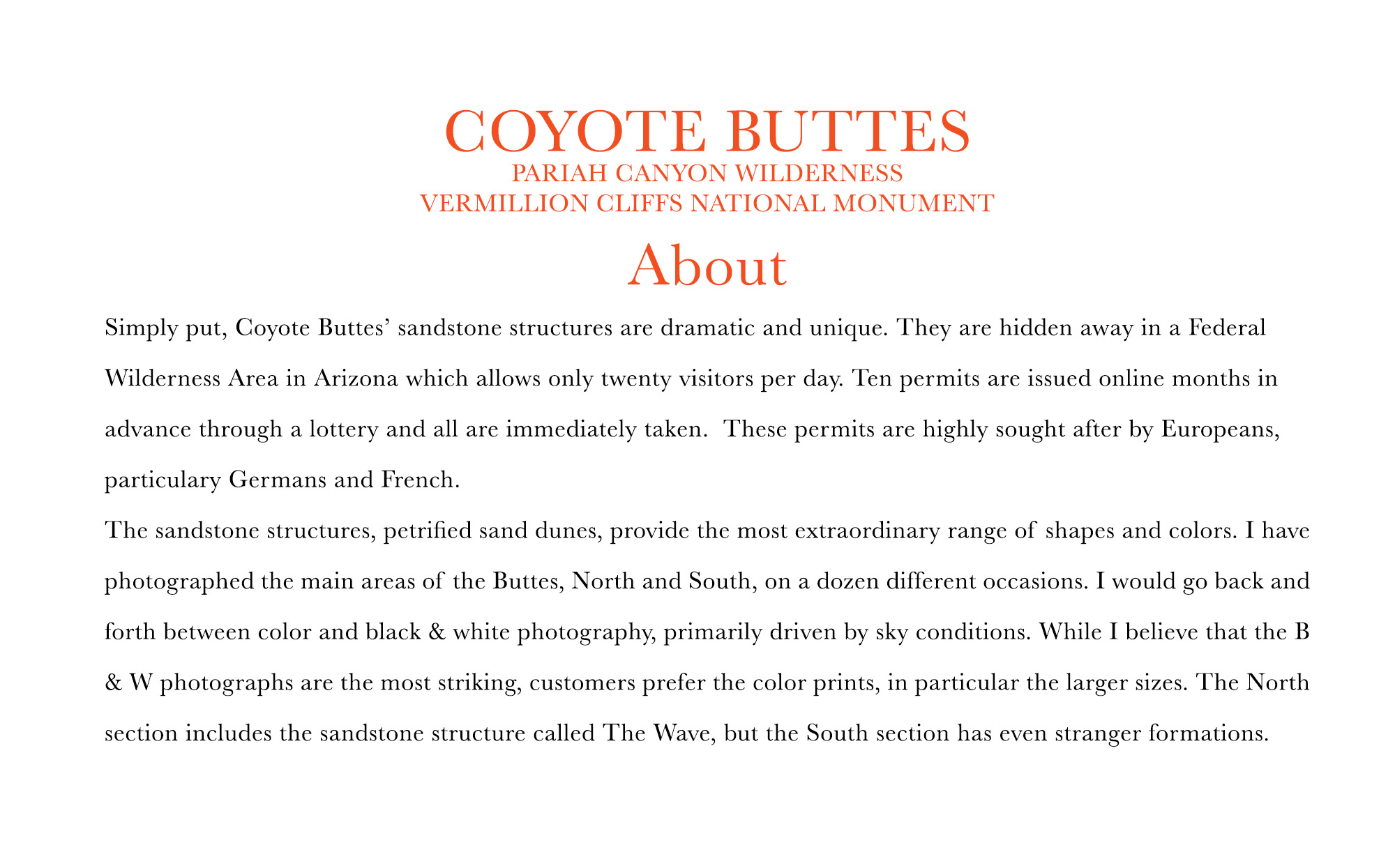 The structures provide the most extraordinary range of shapes and colors. I have photographed the main areas of the Buttes, North and South, on a dozen different occasions. I would go back and forth between color and black & white photography, primarily driven by sky conditions. While I believe that the B & W photographs are the most striking, customers prefer the color prints, in particular the larger sizes. Most published images of the area attempt to hide the location, which I find selfish. I have included all necessary information in the Source section. The North section includes the sandstone structure called The Wave, but the South section has even stranger formations.