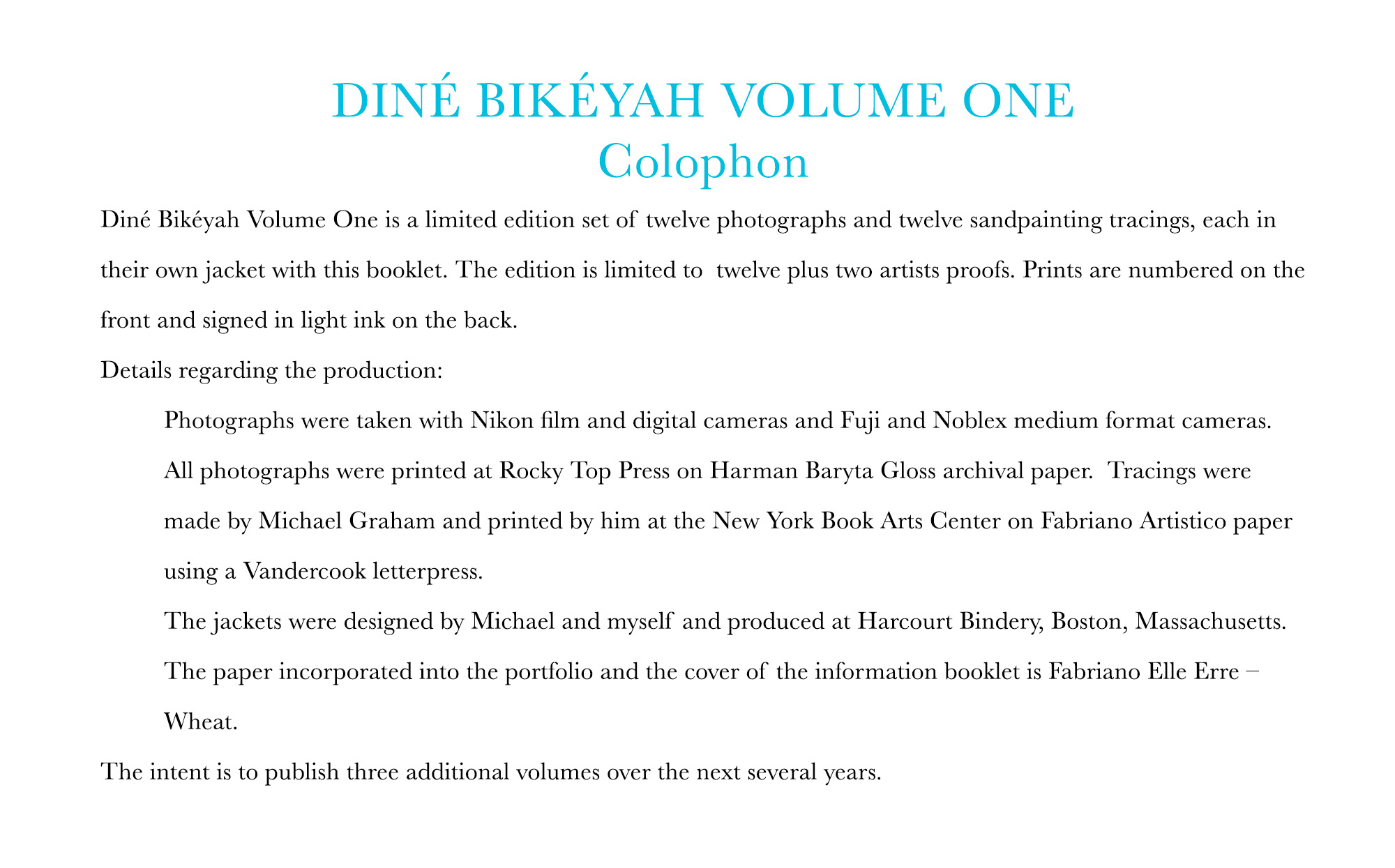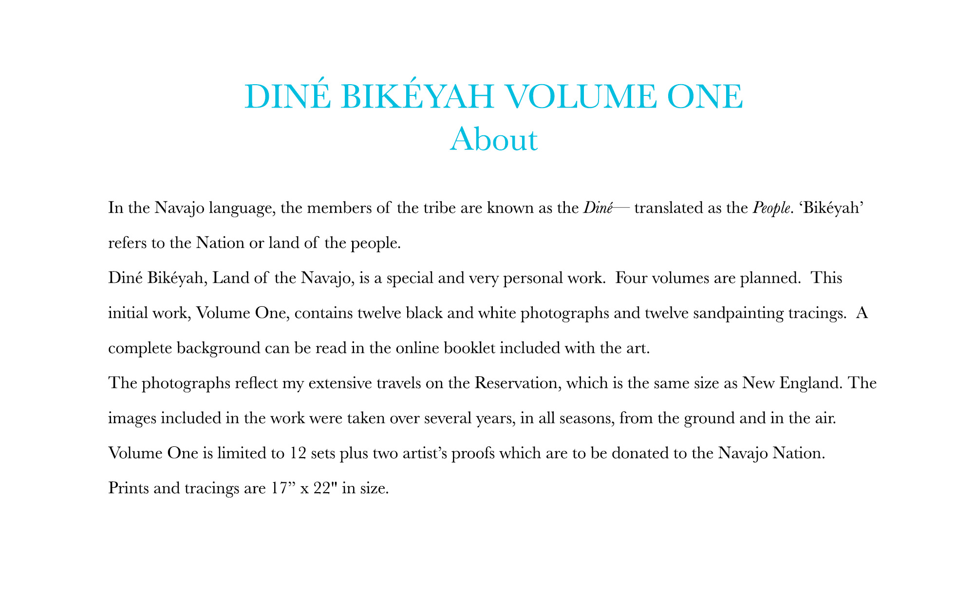 In the Navajo language, the members of the tribe are known as the ‘Diné’— the People. ‘Bikéyah’ refers to the nation or land of the people. Diné Bikéyah, Land of the Navajo, is a special and very personal work. Four volumes are planned.