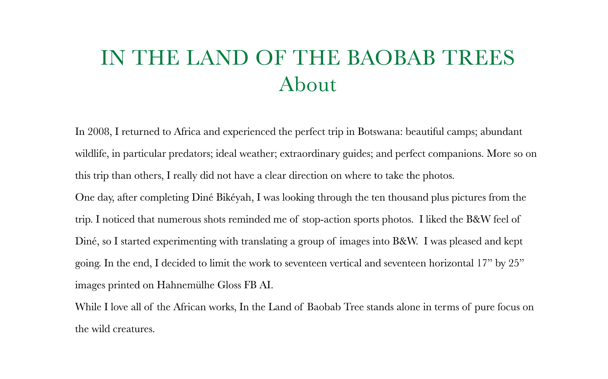 In 2008, I returned to Africa and experienced the perfect trip in Botswana: beautiful camps; abundant wildlife, in particular predators; ideal weather; extraordinary guides; and perfect companions. More so on this trip than others, I really did not have a clear direction on where to take the photos.