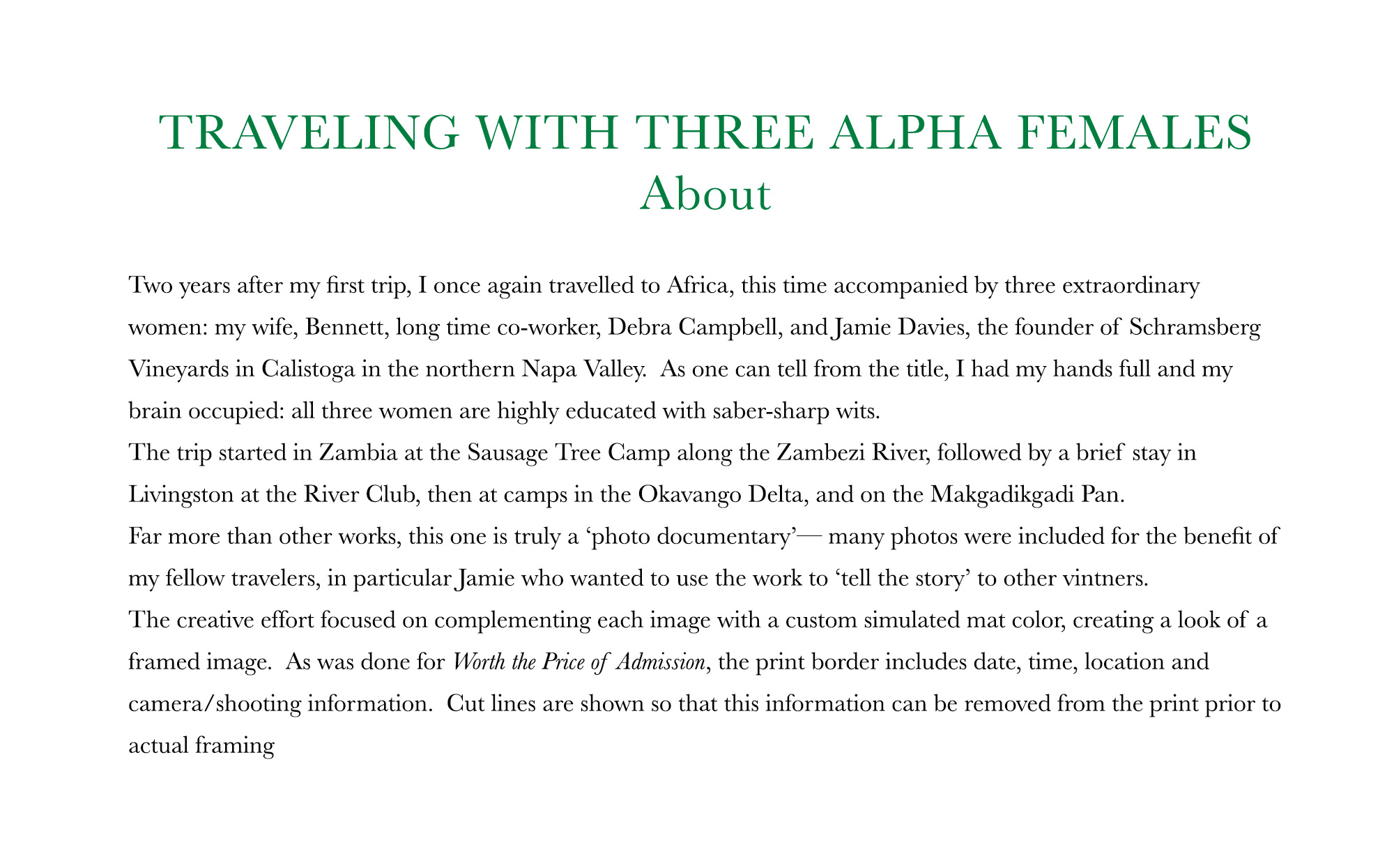 Two years after my first trip, I once again travelled to Africa, this time accompanied by three extraordinary women: my wife, Bennett, long time co-worker, Debra Campbell, and Jamie Davies, the founder of Schramsberg Vineyards in Calistoga in the northern Napa Valley. As one can tell from the title, I had my hands full and my brain occupied: all three women are highly educated with saber-sharp wits.