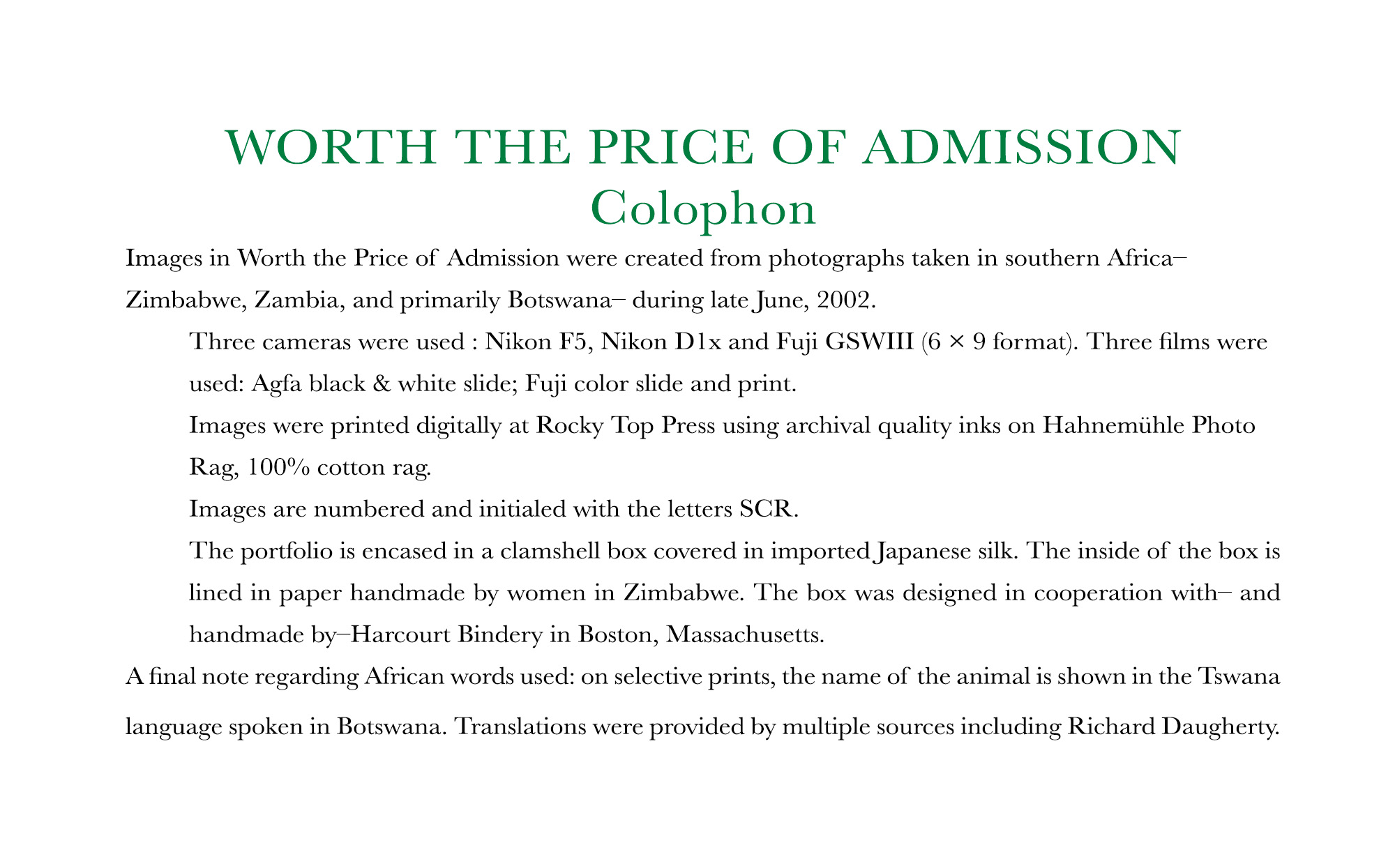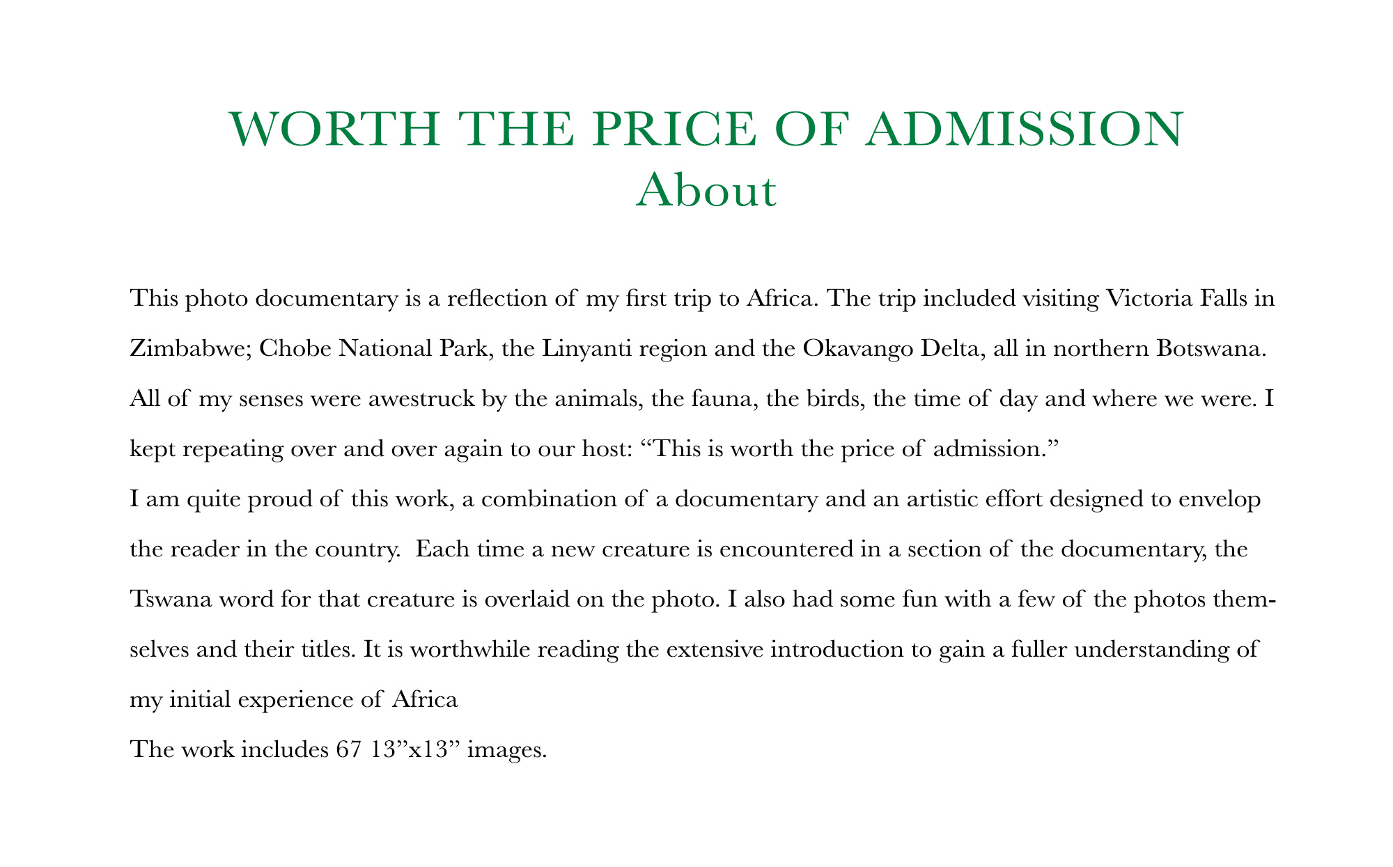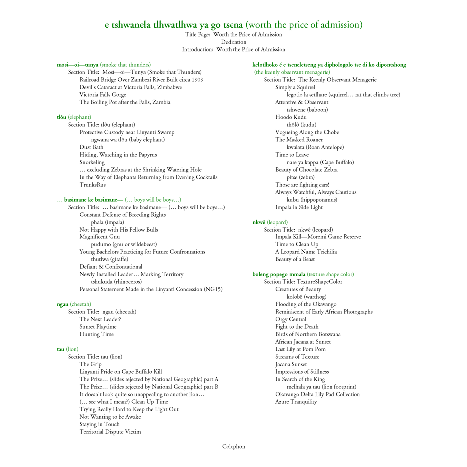I am quite proud of this work, a combination of a documentary and an artistic effort designed to envelop the reader in the country. Each time a new creature is encountered in a section of the documentary, the Tswana word for that creature is overlaid on the photo. I also had some fun with a few of the photos themselves and their titles. It is worthwhile reading the extensive introduction to gain a fuller understanding of my initial experience of Africa.
